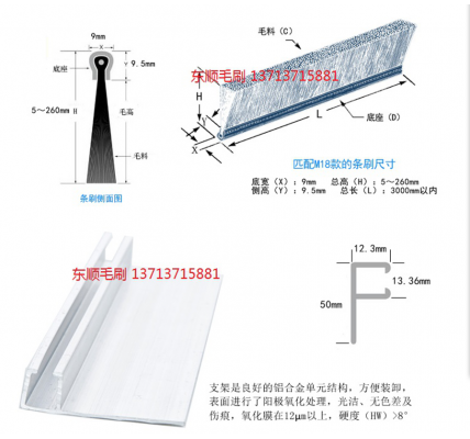 毛刷長度: 20mm(最短)、1000mm、1200mm、1500mm、2000mm、5000MM、 10000mm(最長)等 鋼帶底厚:最小2.5mm(最?。?,3mm,3.5mm,4mm,4.5mm,5mm---------12mm(最厚)鋼帶側(cè)高:比如3*3(3mm厚*3mm側(cè)高)亦可做做3*4(3mm厚*4mm側(cè)高),5*5(5mm厚*5mm側(cè)高)亦可做做5*5(5mm厚*7mm側(cè)高)。