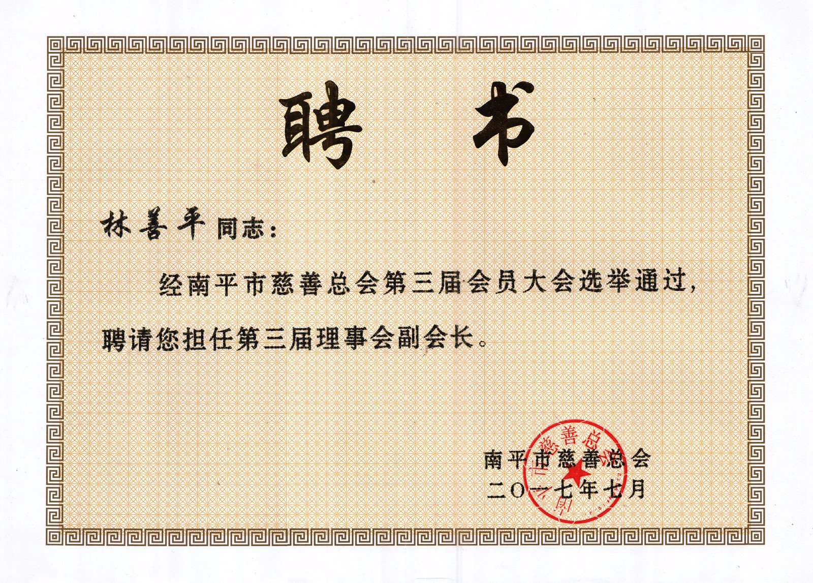 2017年7月28日,南平市慈善捐贈大會暨市慈善總會換屆會議在南平市委舉行,福建順昌虹潤董事長林善平再次當選為南平市慈善總會第三屆理事會副會長,這也是林善平董事長第三次當選此職。同時,在本次慈善捐贈大會上,他再次向市慈善總會捐款50萬元。他表示,他還將一如既往,繼續加大對社會公益事業的支持力度,積極投身公益和慈善事業,為南平市的慈善事業作出更大的貢獻。目前,林善平董事長各項公益捐款累計已達1000余萬元。