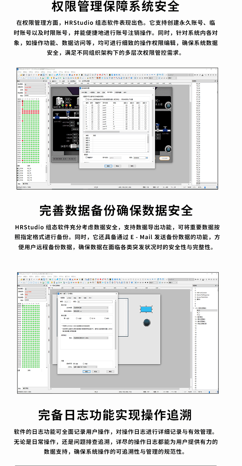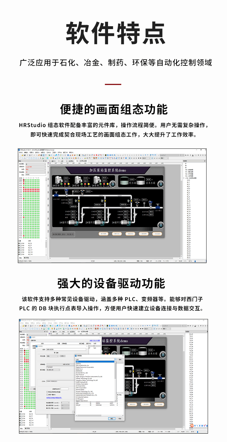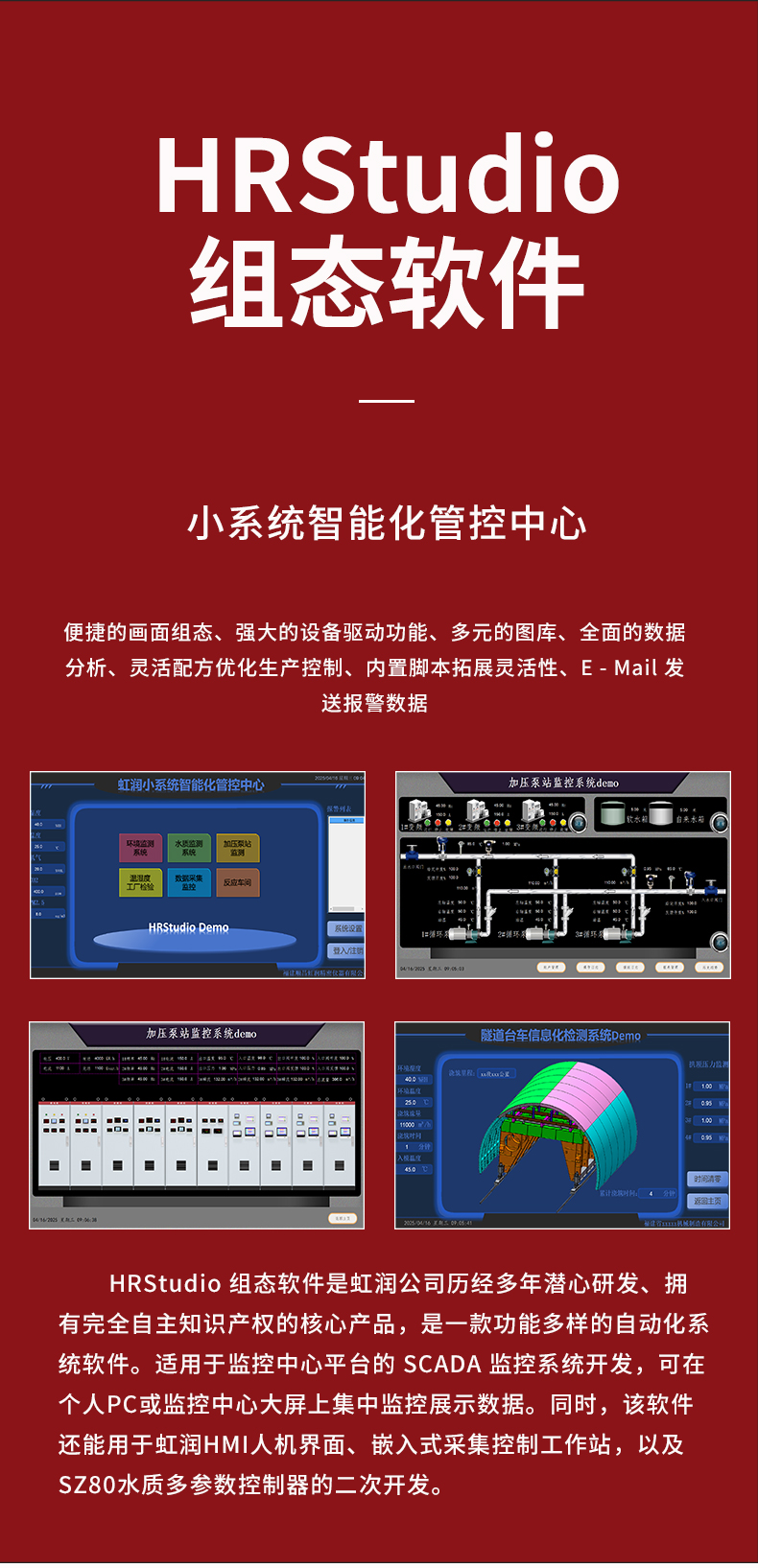 虹潤(rùn)公司是專(zhuān)業(yè)研發(fā)組態(tài)軟件的國(guó)家專(zhuān)精特新“小巨人”企業(yè)。開(kāi)發(fā)的HRStudio組態(tài)軟件,具有便捷組態(tài)畫(huà)面,強(qiáng)大設(shè)備驅(qū)動(dòng),多元化的圖庫(kù),數(shù)據(jù)庫(kù)操作,內(nèi)置腳本拓展,權(quán)限管理數(shù)據(jù)備份等特點(diǎn)。產(chǎn)品獲得嵌入式數(shù)據(jù)采集工作站組網(wǎng)系統(tǒng)等1項(xiàng)國(guó)家發(fā)明專(zhuān)利,主持起草通信系統(tǒng)多通道數(shù)據(jù)采集控制終端規(guī)范軍用標(biāo)準(zhǔn),空間數(shù)據(jù)與信息數(shù)據(jù)傳輸系統(tǒng)等2項(xiàng)航天標(biāo)準(zhǔn),以及現(xiàn)場(chǎng)設(shè)備集成等5項(xiàng)智能制造國(guó)家標(biāo)準(zhǔn)。參與國(guó)際5G標(biāo)準(zhǔn)制定,取得HRStudio 畫(huà)面組態(tài) 等1項(xiàng)相關(guān)軟件著作權(quán)。產(chǎn)品廣泛應(yīng)用于冶金、石化、制藥、設(shè)備配套、環(huán)境監(jiān)測(cè)、農(nóng)業(yè)、生產(chǎn)過(guò)程控制等諸多領(lǐng)域。